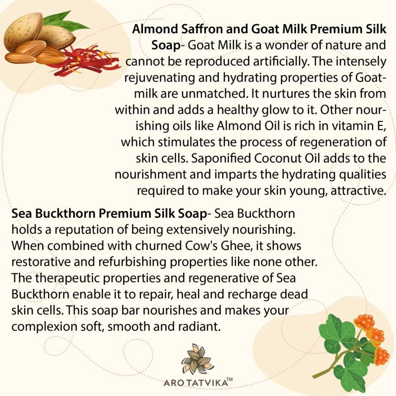 Almond Saffron and Goat Milk Premium Silk Soap- Goat Milk is a wonder of nature and cannot be reproduced artificially. The intensely rejuvenating and hydrating properties of Goatmilk are unmatched. It nurtures the skin from within and adds a healthy glow to it. Other nourishing oils like Almond Oil is rich in vitamin E, which stimulates the process of regeneration of skin cells. Saponified Coconut Oil adds to the nourishment and imparts the hydrating qualities required to make your skin young, attractive and healthy!