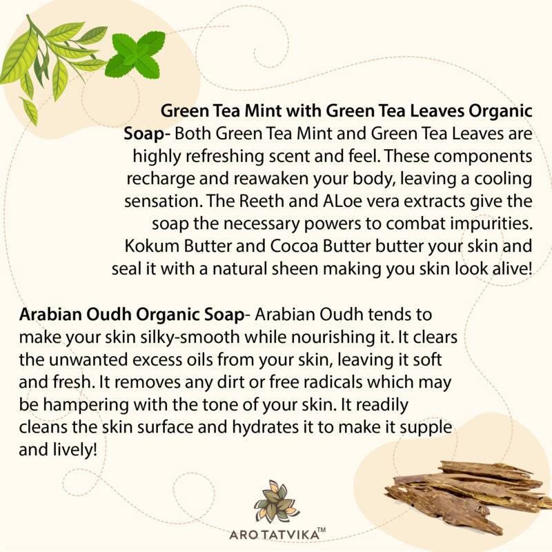 Green Tea Mint with Green Tea Leaves Organic Soap- Both Green Tea Mint and Green Tea Leaves are highly refreshing scent and feel. These components recharge and reawaken your body, leaving a cooling sensation. The Reeth and ALoe vera extracts give the soap the necessary powers to combat impurities. Kokum Butter and Cocoa Butter butter your skin and seal it with a natural sheen making you skin look alive and young!